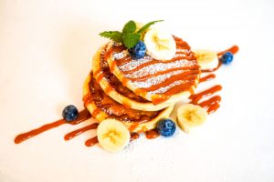 Breakfast: Vegan pancakes topped with fresh fruit and a drizzle of maple syrup.